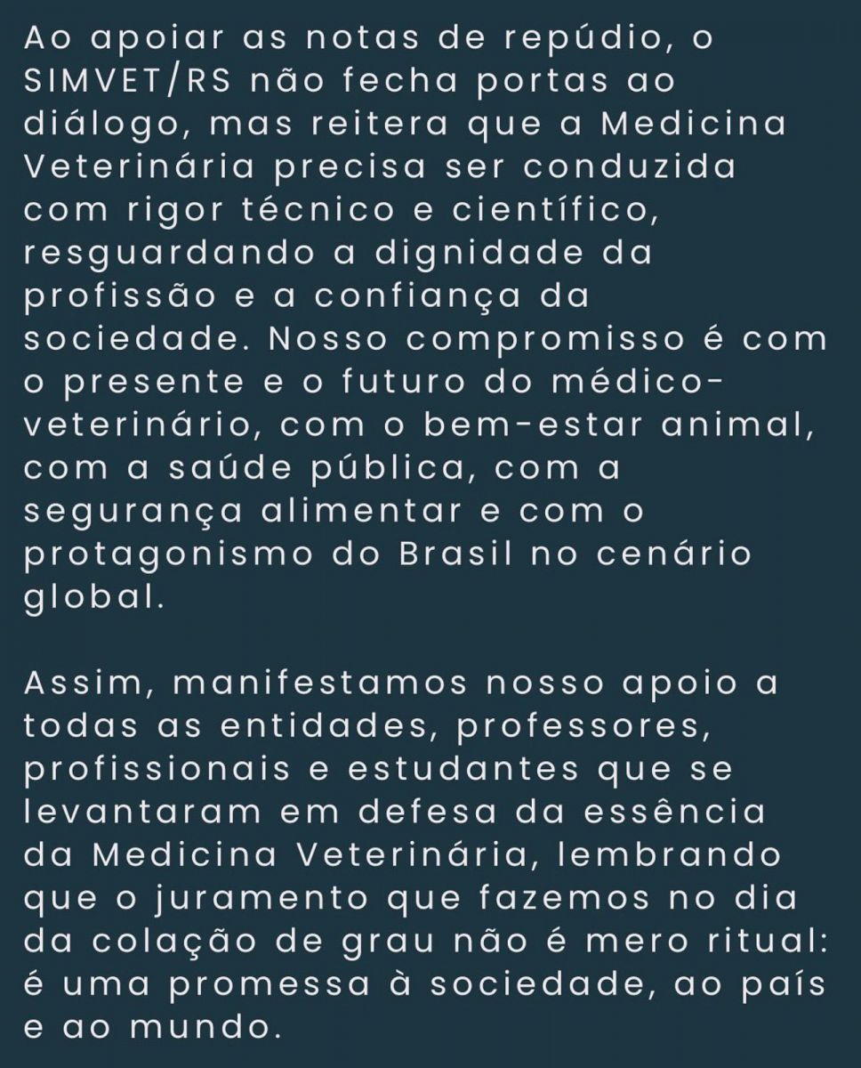 Vivemos um tempo de intensas transformações políticas, sociais e econômicas. A universidade pública tem papel fundamental na inclusão, no debate democrático e na aproximação com populações historicamente marginalizadas. O SIMVET/RS reconhece e valoriza esses avanços. No entanto, a Medicina Veterinária, como profissão estratégica para o Brasil e para o mundo, não pode ser instrumentalizada por discursos que enfraqueçam sua base técnica, científica e regulatória.