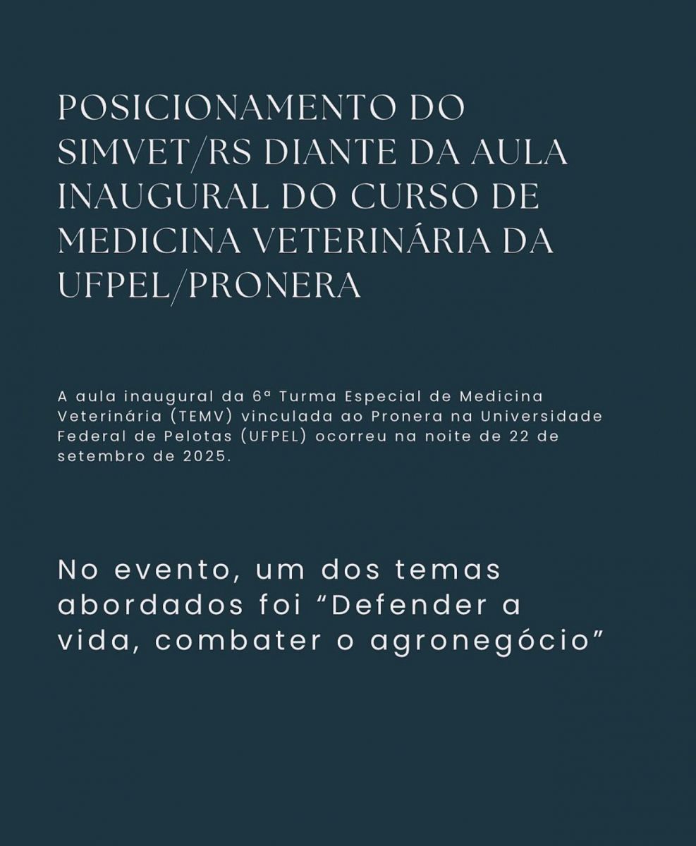 O Simvet/RS, atento à repercussão nacional da aula inaugural do curso de Medicina Veterinária da Universidade Federal de Pelotas (UFPEL), vinculada ao Pronera, entende como legítimas as diversas notas de repúdio que emergiram da comunidade acadêmica, científica e profissional. O nosso apoio a esse movimento não se pauta em disputas ideológicas superficiais, mas sim em fundamentos técnicos, éticos e na defesa intransigente da Medicina Veterinária enquanto ciência a serviço da sociedade.