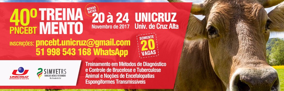Para atender o interesse de Médicos-Veterinários no treinamento para a habilitação, a UNICRUZ – Universidade de Cruz Alta, com o apoio do SIMVETRS promoverá, de 20 a 24/11/2017, o 40º Treinamento em Métodos de Diagnóstico e Controle de Brucelose e Tuberculose Animal e Noções de Encefalopatias Espongiformes Transmissíveis, na cidade de Cruz Alta/RS.