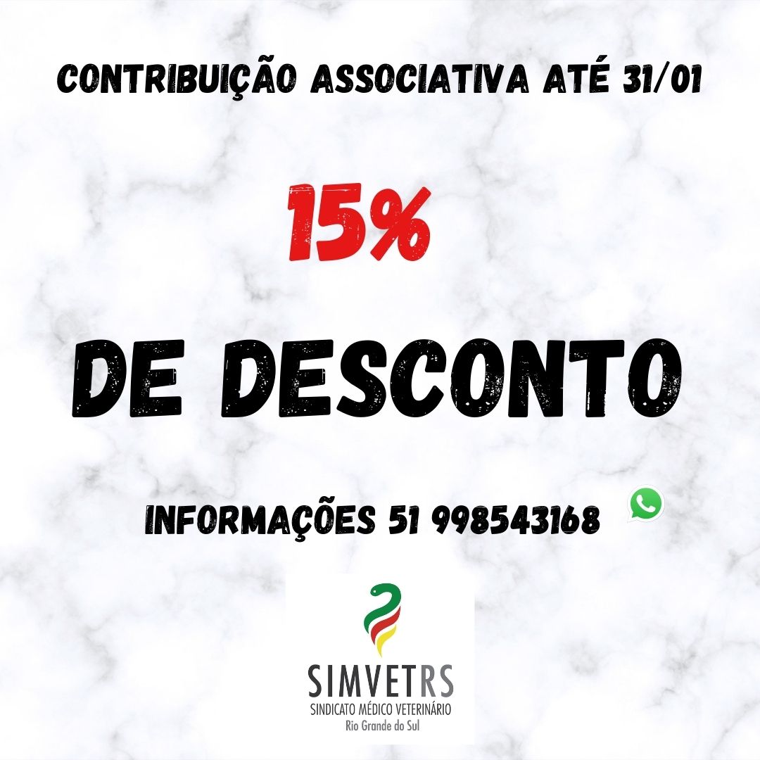 O Simvet/RS PRORROGOU o pagamento da anuidade da Contribuição Associativa 2022 paga até o dia 28 de fevereiro e está com 15% de desconto. Com isso, o valor fica em R$ 200,00.
