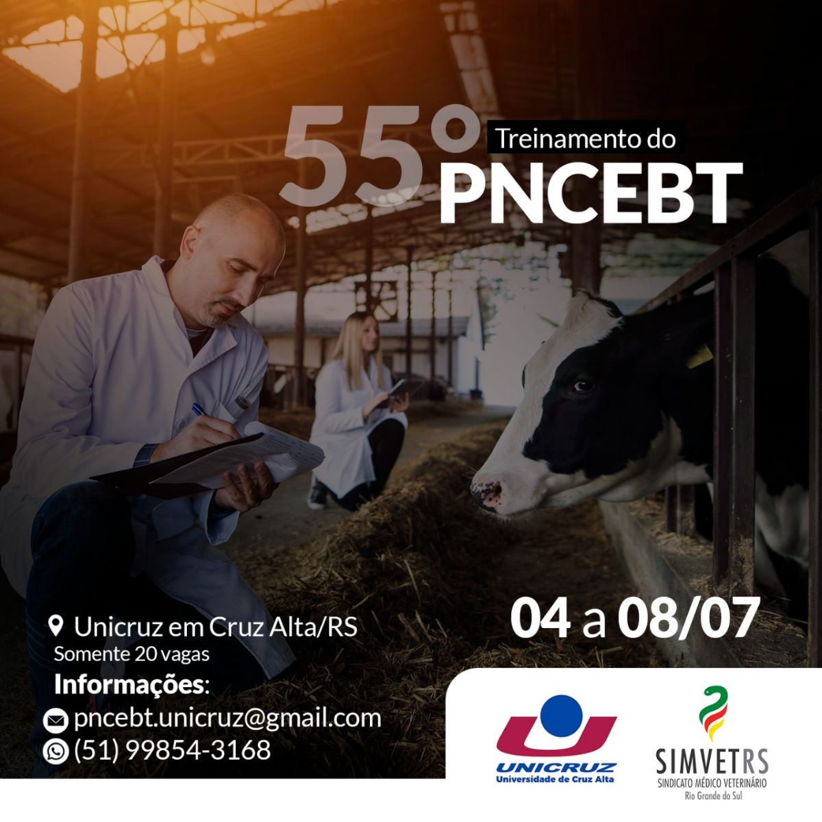 Para atender o interesse de Médicos Veterinários no treinamento para a habilitação, a UNICRUZ — Universidade de Cruz Alta, com o apoio do SIMVETRS promoverá de 04 a 08/07/2022, o 55º Treinamento em Métodos de Diagnóstico e Controle de Brucelose e Tuberculose Animal e Noções de Encefalopatias Espongiformes Transmissíveis, na cidade de Cruz Alta/RS.