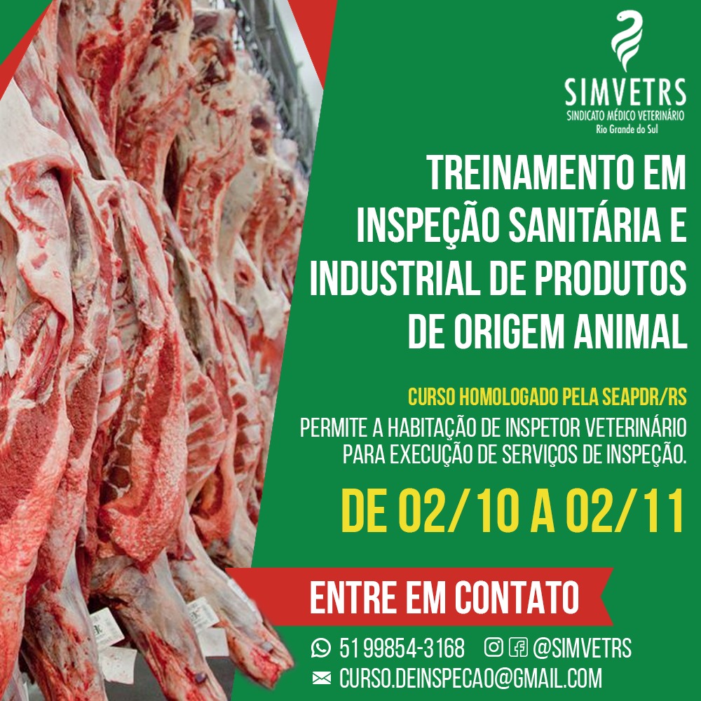 Para atender o interesse de Médicos Veterinários no treinamento para credenciamento junto a SEAPDR/RS, o SIMVETRS promoverá o 7º Treinamento de Inspeção e Tecnologia de Alimentos de Origem Animal. As inscrições podem ser feitas através do email: curso.deinspecao@gmail.com